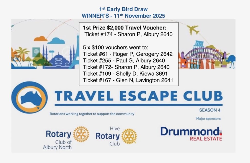 Early Bird Prizes include 1 x $2000 Travel Voucher (or CoL voucher) and 5 x $1000 retail vouchers donated by a wide selection of businesses.(Early Bird draws – 11th November 2025 and 10th March 2026)