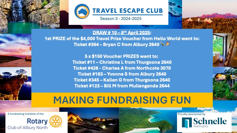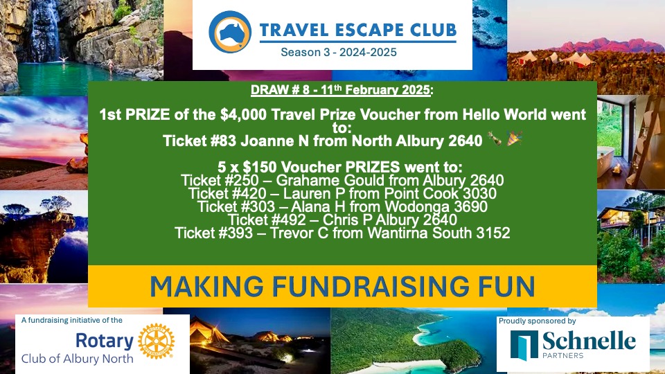 Each draw takes place on the 2nd Tuesday at 6pm before the Rotary Club of Albury North’s meeting Â